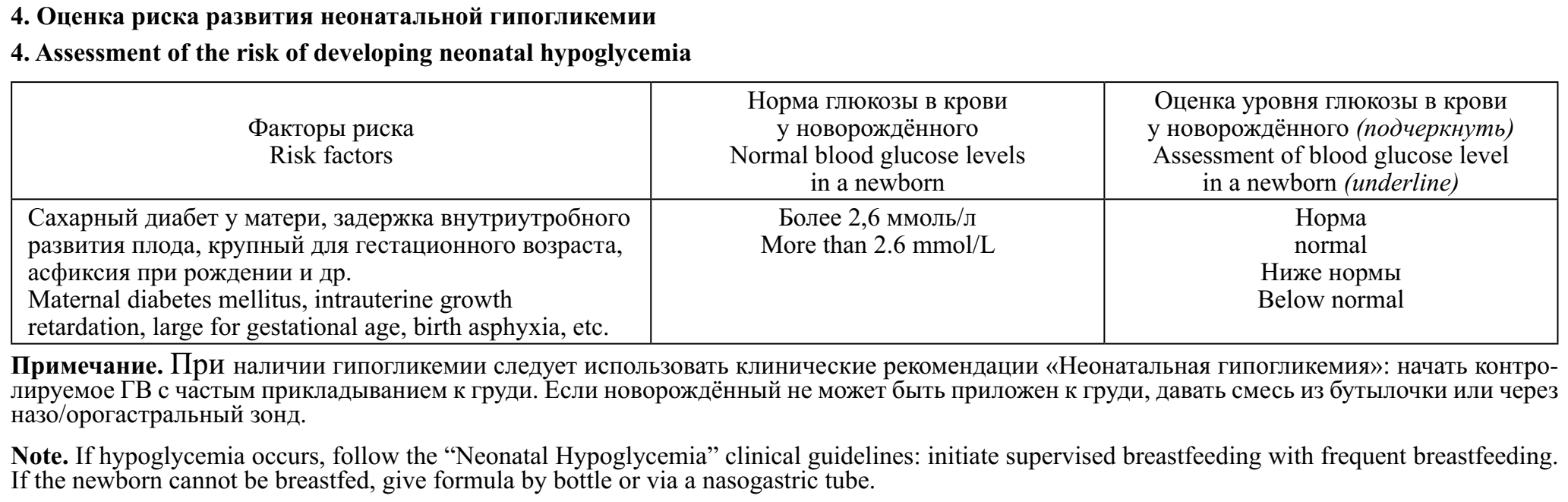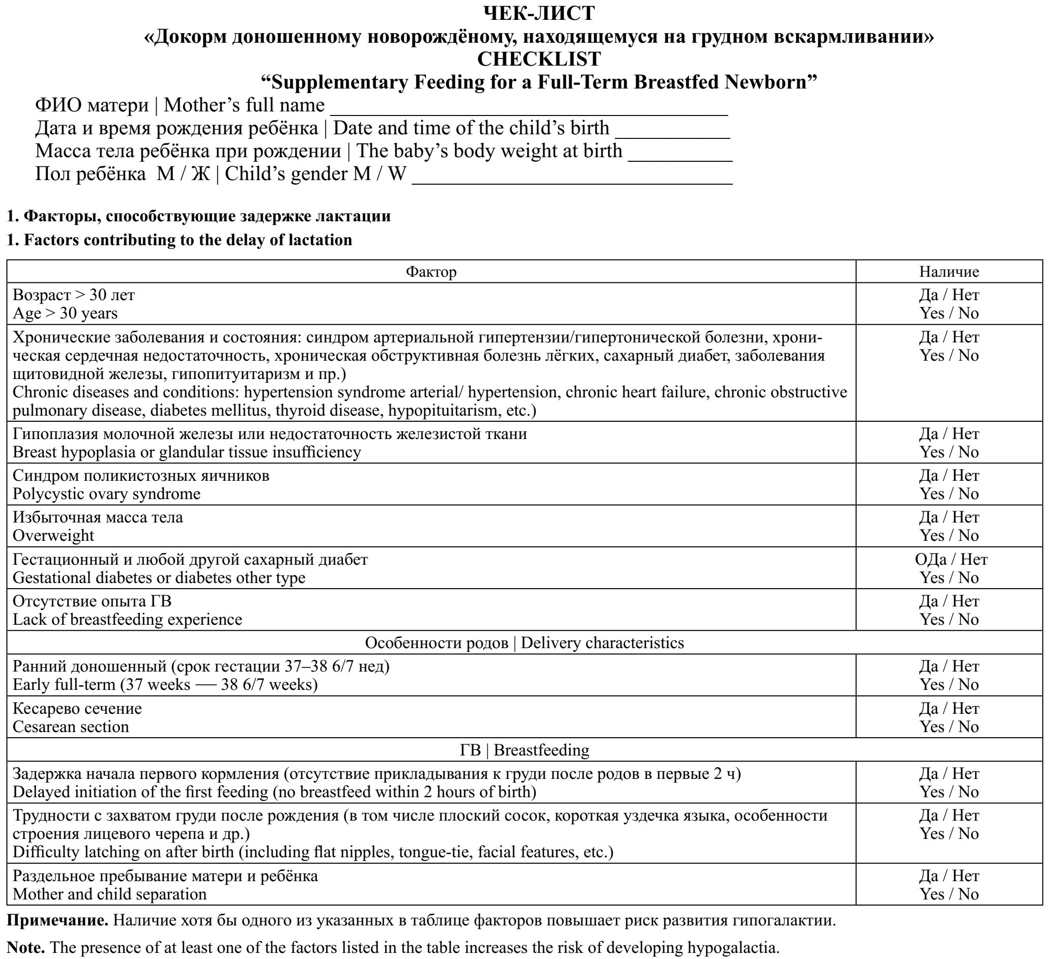 Материнское молоко является золотым стандартом питания детей грудного возраста, поэтому отечественные специалисты и эксперты ВОЗ рекомендуют в первые месяцы жизни поддерживать исключительно грудное вскармливание (ИГВ) [1, 2]. Одним из значимых подходов к становлению грудного вскармливания (ГВ), обеспечивающих его дальнейшую успешность, является его инициация в 1-й час после рождения, поскольку это время начала становления лактации и адаптации как матери, так и ребёнка к ГВ. Использование дополнительного питания допустимо и необходимо при наличии у новорождённого медицинских показаний. Однако данный тезис часто игнорируется, что может привести к развитию ряда транзиторных патологических состояний, представляющих угрозу для жизни ребёнка. К ним относятся неонатальные гипогликемия, особенно среди детей из группы риска по её развитию, гипернатриемия, гипербилирубинемия, связанные с недостаточным поступлением грудного молока (ГМ) [3–5]. Необходимость разрешения сложившейся ситуации явилась основанием для разработки чек-листа (проверочного списка для стандартизации процессов), определяющего тактику врача по оценке недостаточного поступления ГМ новорождённому и наличие медицинских показаний к введению докорма.