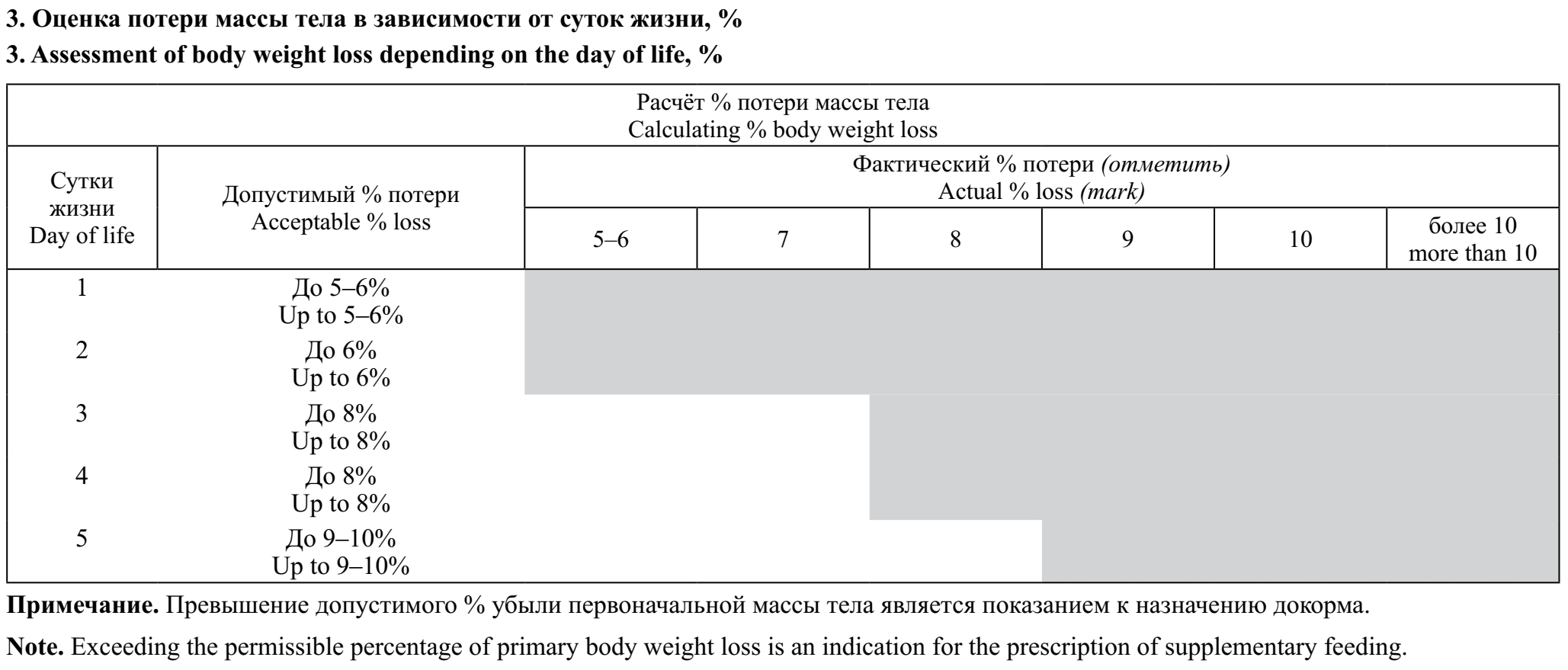 Показаниями к инициации и использованию докорма адаптированной детской смесью со стороны ребёнка являются гипогликемия (уровень глюкозы в периферической крови новорождённого менее 2,6 ммоль/л), которая не купируется частым прикладыванием к груди; признаки, указывающие на недостаточное количество ГМ у матери, а именно клинические или лабораторные признаки обезвоживания ребёнка (вялость, сухость слизистых оболочек, урежение мочеиспусканий, повышение уровня натрия в сыворотке крови); избыточная первоначальная убыль массы тела; наличие гипербилирубинемии, связанной с недостаточным потреблением ГМ (начинается на 2–5-й день жизни, часто сочетается с патологической убылью массы тела, задержкой стула и урежением мочеиспускания); стул менее 4 раз за первые 4 сут жизни или продолжение отхождения мекония на 5-е сутки [1, 15]. Номограммы допустимой потери массы тела у новорождённых детей в раннем неонатальном периоде за 10 лет использования показали свою клиническую эффективность [16]. При оптимальной поддержке ГВ первоначальная убыль массы тела составляет в среднем 5,5%. На основании полученных данных были разработаны почасовые номограммы потери массы тела для здоровых новорождённых, которые явились основой программы, доступной для использования на любом электронном устройстве (http://www.newbornweight.org). Потеря первоначальной массы тела не должна превышать 75-й центиль, или 5–6% через 1 сут после рождения, 7–8% — через 2 сут, 9–10% — через 3 сут и более. Более высокие значения убыли массы тела являются медицинскими показаниями для назначения докорма [16].
