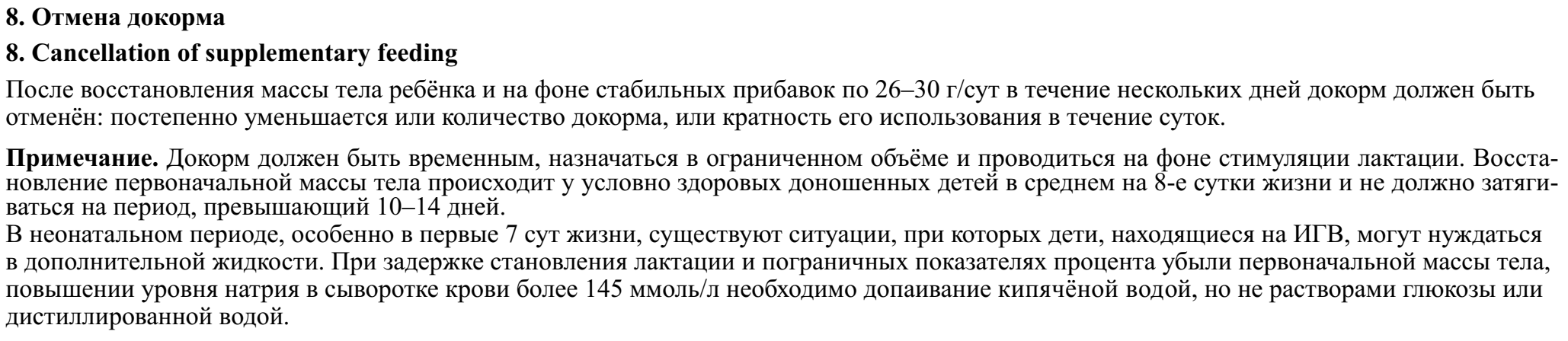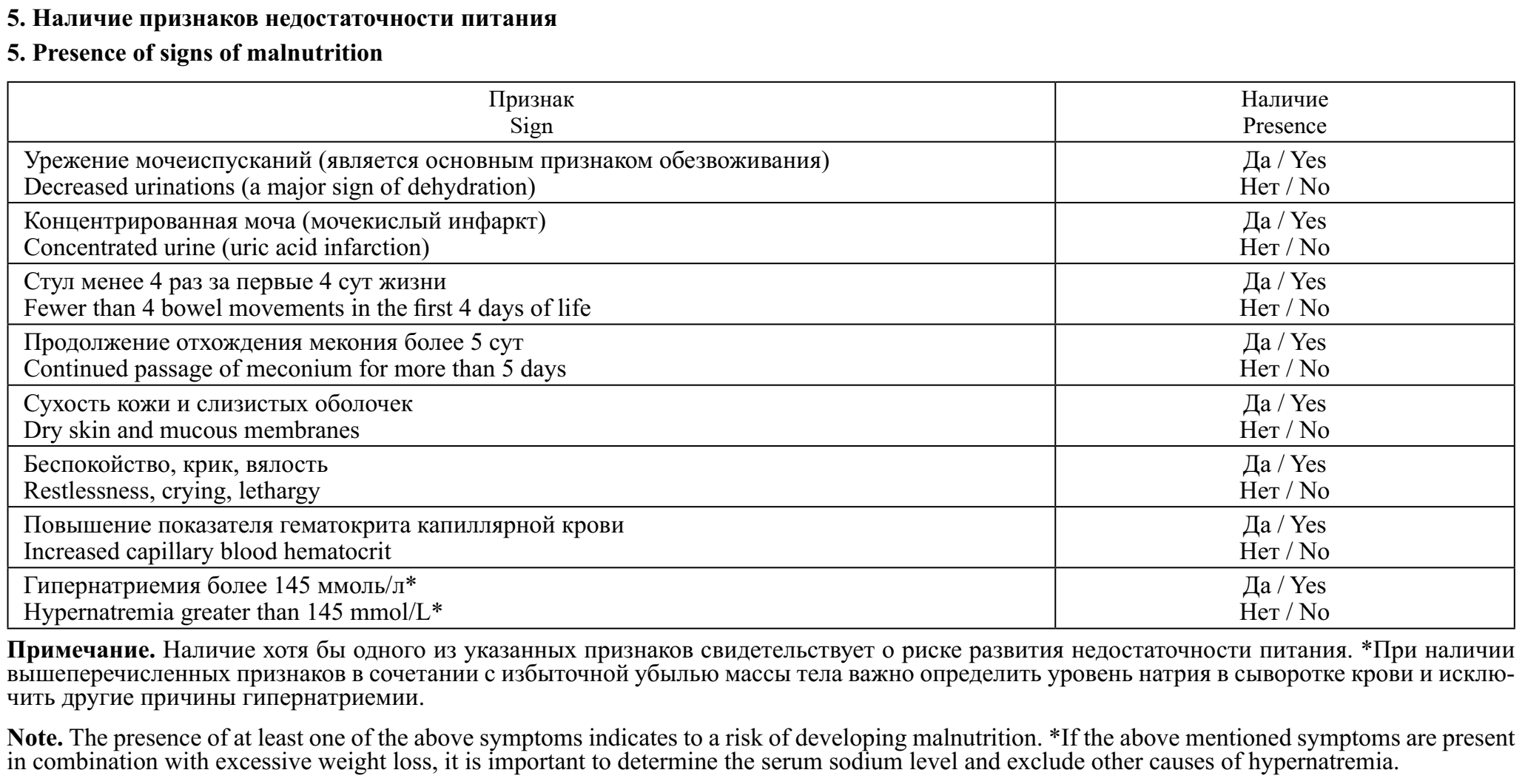 Заключение. В неонатальном периоде существуют различные состояния, которые могут потребовать назначения новорождённому дополнительного питания в случае недостатка материнского молока. Разработанный чек-лист по назначению докорма является современной технологией сохранения грудного вскармливания и важным практическим шагом его поддержки с первых суток жизни ребёнка.