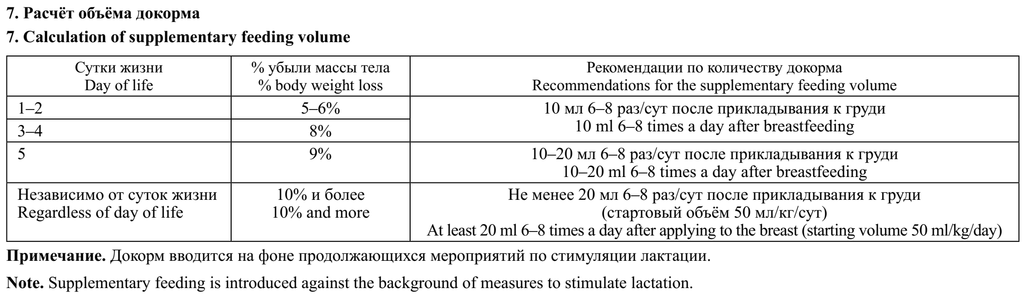 Установлено, что около 15% здоровых первородящих матерей, мотивированных на ИГВ, имели недостаточное количество ГМ, несмотря на интенсивную поддержку и необходимые вмешательства в период становления лактации. При ИГВ задержка лактогенеза (более 72 ч) у таких матерей может превысить толерантность новорождённого и сопровождаться снижением массы тела и обезвоживанием, приводящим к гипернатриемии, гипербилирубинемии и гипогликемии у каждого третьего ребёнка [3]. При этом простой мониторинг потери массы тела ребёнка, информирование родителей о признаках голода и обезвоживания, а также назначение докорма при появлении признаков неоптимального питания и потери массы тела могли бы предотвратить 98% случаев гипернатриемической дегидратации. Поэтому комплексная профилактическая программа, включающая своевременное введение докорма, может предотвратить возникновение осложнений неоптимального питания и повторные госпитализации у десятков тысяч младенцев [3, 18].