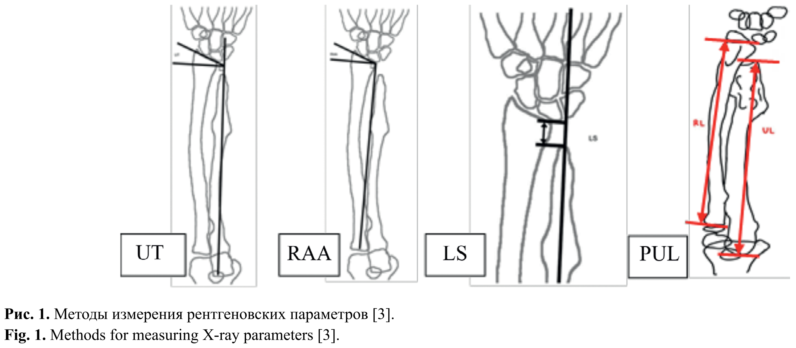 Всем больным проводилась рентгенография костей предплечья с проведением ангулометрии до и после оперативного лечения. Рентгенография костей предплечья и кисти выполнялась в прямой и боковой проекции с захватом суставов кисти и локтевого сустава. Для анализа использовались 4 рентгеновских параметра, которые можно использовать как предикторы вывиха головки ЛуК и нестабильности лучелоктевого сустава (рис. 1). Первые два параметра — локтевой наклон (ulnar tilt, UT) и лучезапястный суставной угол (radioarticular angle, RAA) — являются показателями, отражающими наклон фасетки лучезапястного сустава и тяжесть осевой деформации ЛуК. Другие параметры: полулунная дистанция (lunate subsidence, LS) и пропорциональная длина ЛоК (proportional ulnar length, PUL) — отношение длины ЛоК к длине ЛуК — тесно связаны друг с другом и отражают укорочение ЛоК.