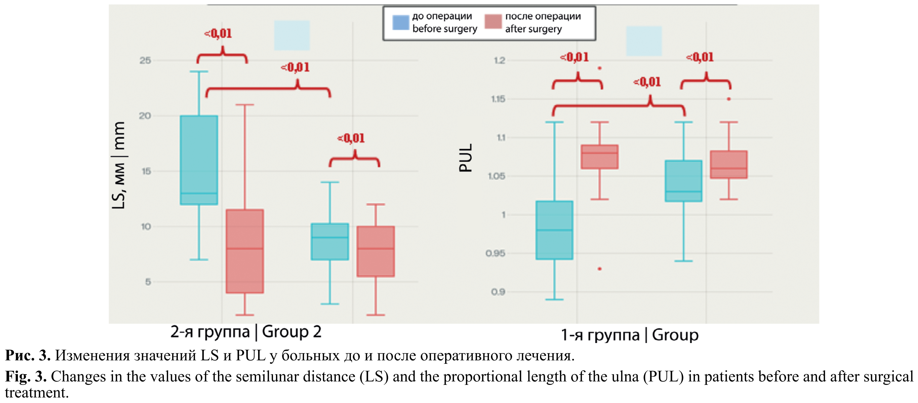 Результаты. У больных 1-й группы все параметры показали статистически значимые изменения до и после операции (p < 0,01). При сравнении результатов операций между группами больных ключевым параметром стал лучезапястный суставной угол (разность 7,75°; p < 0,0001) который показал большее значение у детей 1-й группы. Остальные послеоперационные параметры существенно не различались у больных двух групп.