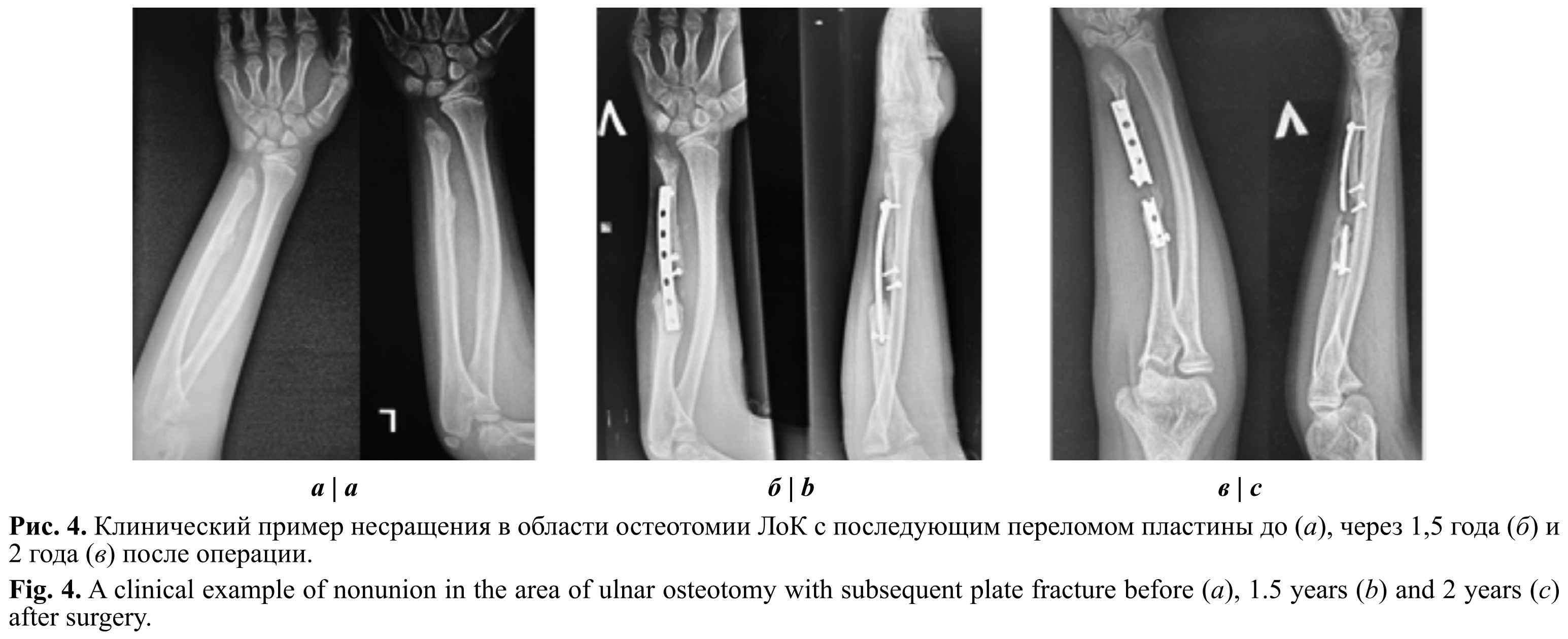 Одним из существенных недостатков приведённых способов является достаточно высокая частота несращения в зоне остеотомии и формирования ложного сустава костей предплечья — до 20% случаев [19]. Удаление экзостозов часто решает функциональные проблемы, такие как восстановление амплитуды пронации и супинации, но не предотвращает формирование косорукости в будущем [10, 19]. Метод гемиэпифизиодеза ЛуК является малотравматичным способом коррекции косорукости.