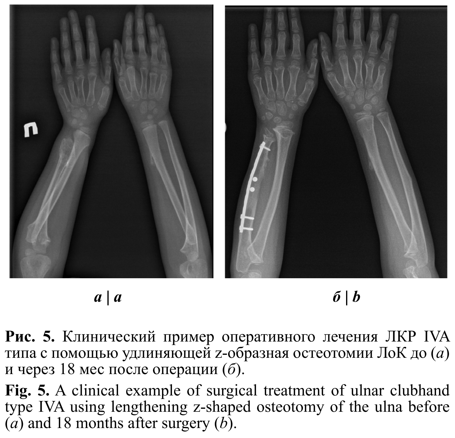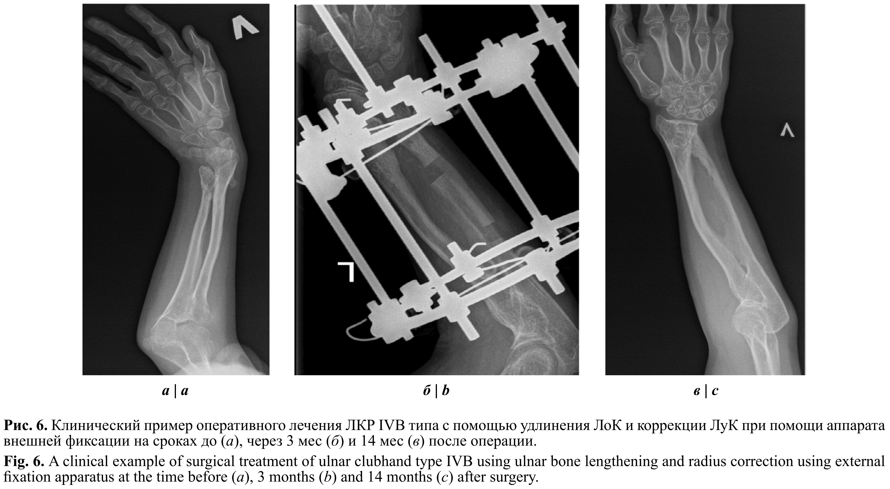 При аппаратной коррекции ЛКР IIb типа у детей нами достигнуты практически идентичные результаты (при таких же близких исходных параметрах) в отношении параметра RAA [7]. Коррекция укорочения длины ЛоК была значимой и составила 5 мм. В нашей работе мы также добились значимой коррекции PUL, которая отражает соотношение длины костей предплечья. При этом отмечается, что чем раньше выполнено удлинение ЛоК, тем больше это влияет на деформацию ЛуК [18]. Увеличивая длину ЛоК с помощью аппарата внешней фиксации, можно положительно влиять на форму ЛуК [13, 14].
