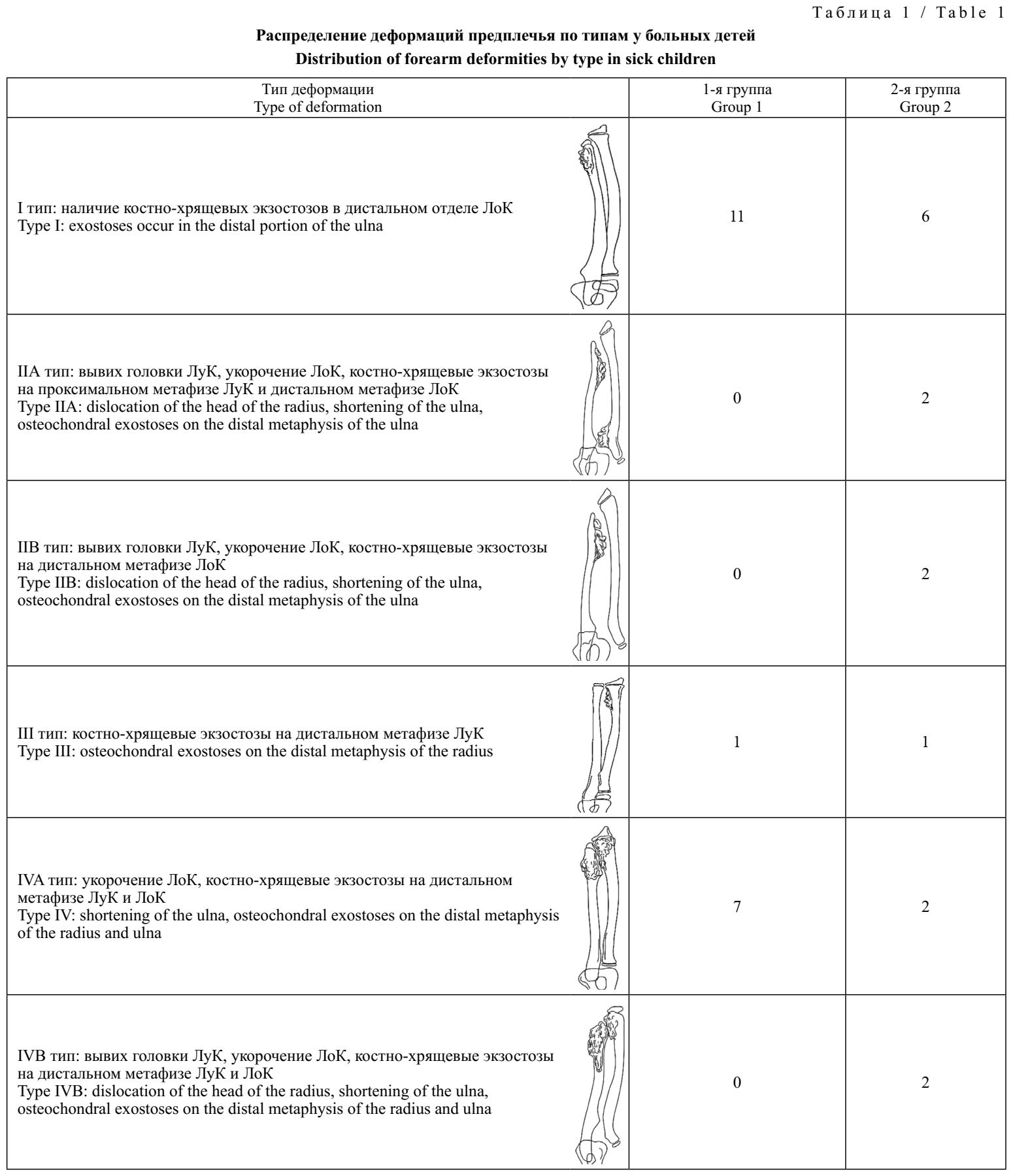 Представленные параметры различаются в зависимости от объёма поражения костей предплечья [2]. В связи с этим нами проведено распределение больных по типам деформаций предплечья (табл. 1).