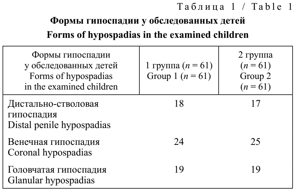 Обследовано 122 мальчика в возрасте 1–3 лет с разными формами гипоспадии (табл. 1). Критериями включения являлись возраст от 1 до 3 лет; дистальные формы гипоспадии у мальчиков. Критерии невключения: наличие интеркуррентных заболеваний; принимаемая ранее в течение последних 6 мес антибактериальная терапия; ИМВП, выявленная при проведении дооперационного обследования; проксимальные формы гипоспадии. Дизайн и протокол обследования одобрены независимым локальным этическим комитетом. Родители подписали добровольное информированное согласие на проведение исследований.