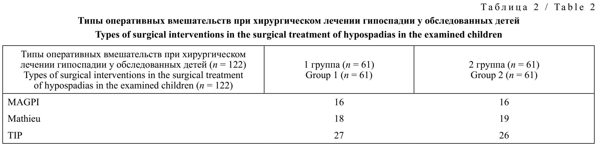 Всем больным уретропластика выполнялась по одной из трёх методик: MAGPI, Mathieu, TIP (табл. 2).