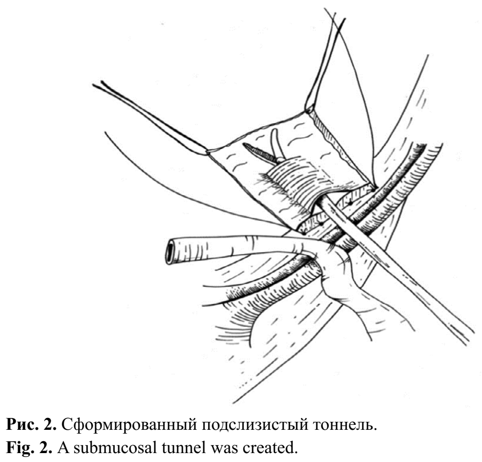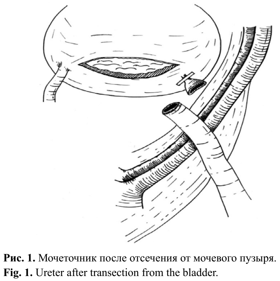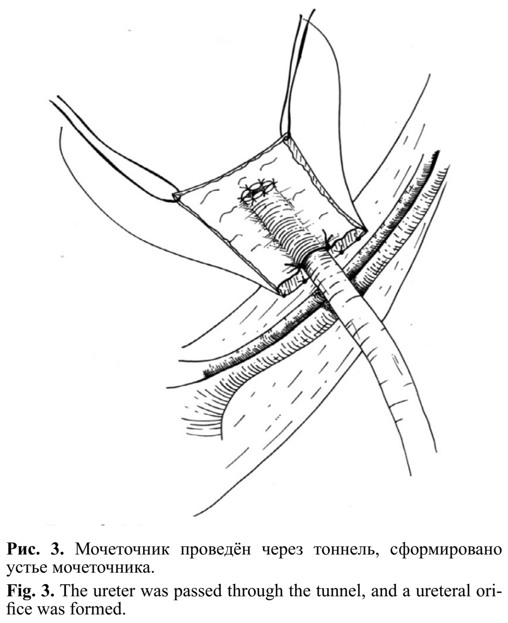 Лапароскопическая продольная реимплантация мочеточника выполнялась в положении на спине под эндотрахеальным наркозом и перидуральной анестезией. Устанавливали 3 троакара: один в область пупочного кольца для оптики и два манипуляционных по среднеключичной линии с двух сторон. После наложения карбоксиперитонеума выполняли мобилизацию дистального отдела мочеточника. Мочеточник прошивали, перевязывали или клипировали у входа в мочевой пузырь и отсекали (рис. 1). При дефиците длины мочеточника мочевой пузырь частично отделяли от передней брюшной стенки, далее выполняли его фиксацию отдельными узловыми швами к m. psoas со стороны отсечённого мочеточника. Мочевой пузырь растягивался на нитях-держалках. Затем проводилось послойное поперечное рассечение мочевого пузыря. Тупой и острой диссекцией между мышечной и слизистой оболочками мочевого пузыря формировался подслизистый тоннель по направлению к шейке мочевого пузыря (рис. 2). Через сформированный тоннель проводили мочеточник, устье формировали отдельными узловыми рассасывающимися швами. Таким образом, неоустье располагалось в положении, близком к физиологическому (рис. 3). В мочеточник устанавливали стент или интубатор. Слизистую оболочку мочевого пузыря ушивали непрерывным швом. Детрузор ушивали отдельными узловыми швами либо непрерывно с фиксацией мочеточника в месте его впадения в созданный антирефлюксный тоннель для предотвращения его экстравезикализации. Восстанавливали целостность париетальной брюшины. В малый таз устанавливали дренаж, который удаляли на 2-е послеоперационные сутки. Дренирование мочевого пузыря уретральным катетером осуществляли в течение 5 сут после оперативного вмешательства.