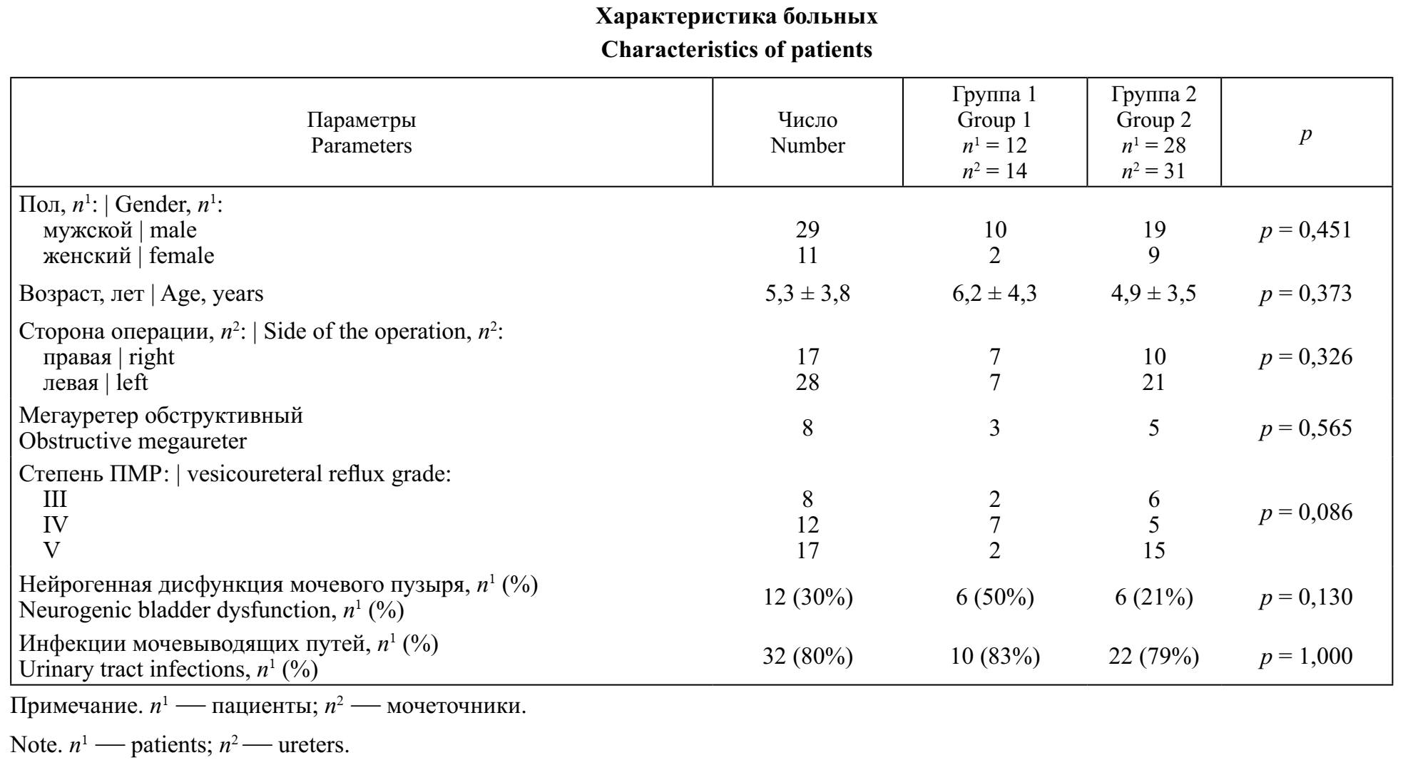 Материалы и методы. В отделении урологии-андрологии в период с 2016 по 2025 г. была выполнена повторная лапароскопическая уретероцистонеоимплантация у 40 больных, на 45 мочеточниках. Возраст детей составил от 10 мес до 16 лет (63,8 ± 45,7 мес). Больные были распределены на 2 группы. В 1-ю группу вошли 12 детей, которым была выполнена лапароскопическая поперечная экстравезикальная реимплантация (14 реимплантированных мочеточников), во 2-ю — 28 больных, которым была выполнена лапароскопическая продольная экстра-интравезикальная уретероцистонеоимплантация (31 реимплантированный мочеточник). Период наблюдения за больными — от 6 мес до 9 лет.