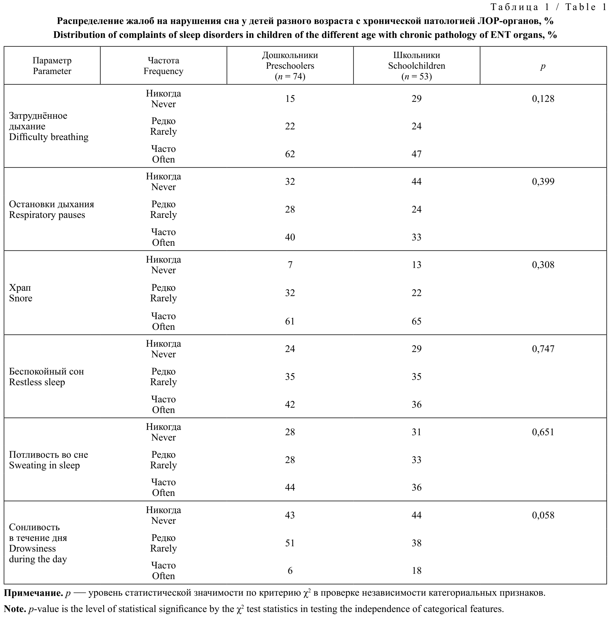 В общей выборке у детей доминировали жалобы на храп (63%), затруднённое дыхание во сне (56%), повышенную потливость во сне (41%), беспокойный сон (39%), остановки дыхания во сне (37%), повышенную дневную сонливость (11%). Только 4% дошкольников и 7% школьников не предъявляли жалоб на сон. Сравнение нарушений сна у детей разного возраста не выявило различий. На частый храп (основной признак нарушения дыхания во сне) были жалобы с одинаковой частотой: у 61% дошкольников и у 65% школьников. На частое затруднённое дыхание во сне (эквивалент храпа у детей) чаще жаловались дошкольники, чем школьники — 62% и 47% соответственно. Спектр жалоб и их частота у детей разного возраста представлены в табл. 1.