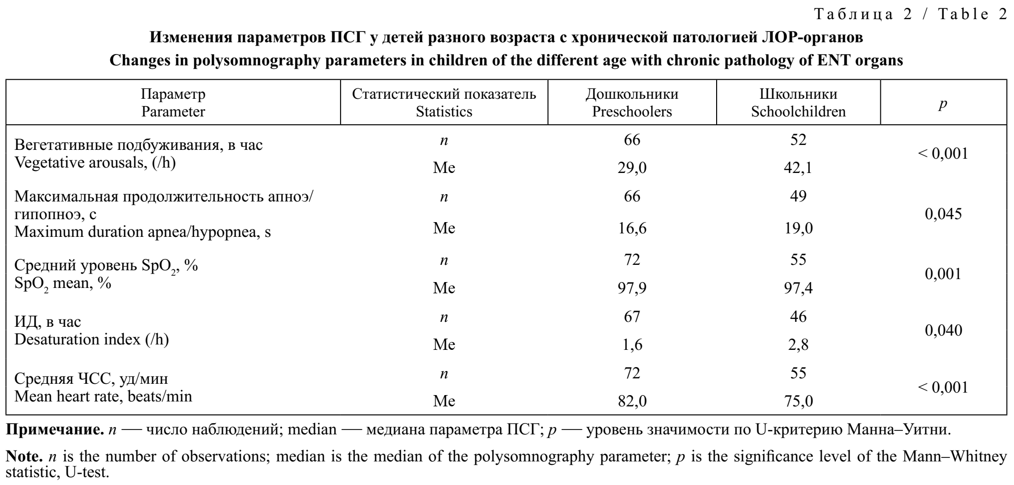 Анализ параметров ПСГ выявил, что у школьников преобладали вегетативные подбуживания, максимальная продолжительность апноэ/гипопноэ и увеличение ИД, а у дошкольников — только ЧСС, что обусловлено их возрастом. При этом изменения показателей ПСГ у мальчиков и девочек характеризовались значимыми различиями 2 параметров: удлинение продолжительности поверхностного сна (N1 стадия) (р = 0,019) и времени бодрствования после засыпания (min) у мальчиков (р = 0,037) (табл. 2).