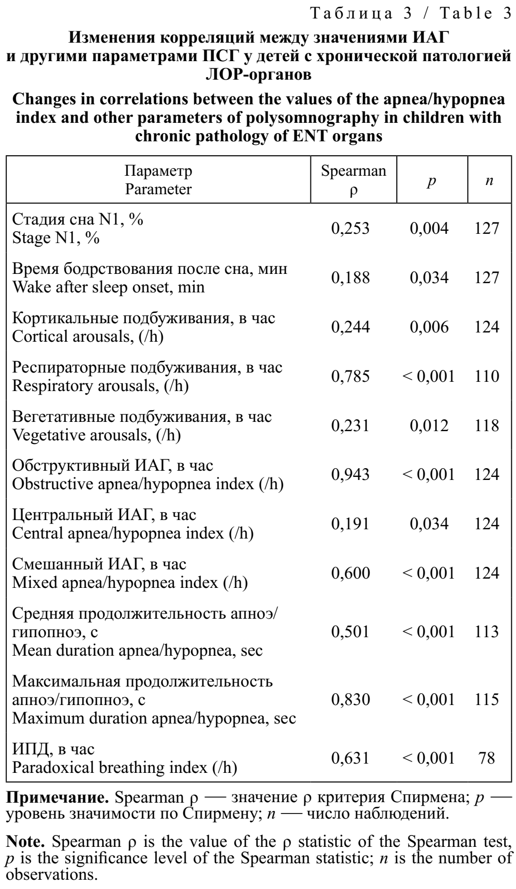Значения общего ИАГ тесно коррелировали с уровнями обструктивного ИАГ (ρ = 0,943; р < 0,001), чем центрального ИАГ (ρ = 0,191; p = 0,034). ИАГ показал значимую связь с признаками нарушения структуры сна — с продолжительностью поверхностного сна (N1 стадия сна) и бодрствования после сна, корковыми, респираторными и вегетативными подбуживаниями, а также с парадоксальным дыханием. Показана положительная сильная связь ИАГ со средней и максимальной продолжительностью апноэ/гипопноэ (табл. 3).