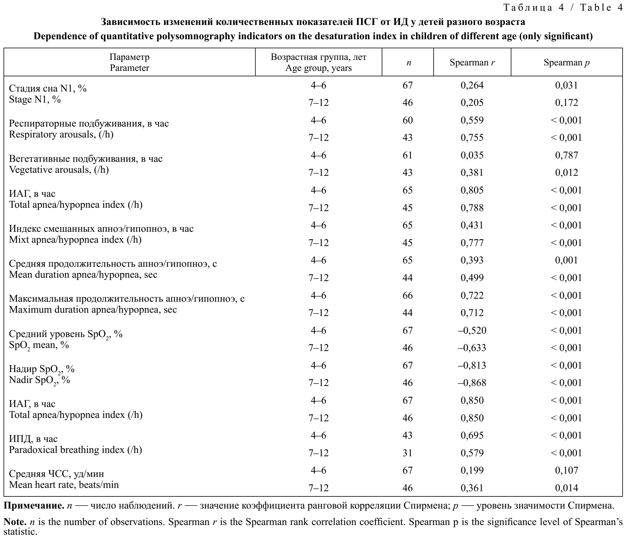 При построении модели ANOVA выявлены значимые связи между значениями ИАГ+возраст с корковыми (р = 0,036; р = 0,021) и вегетативными подбуживаниями (р = 0,043; р < 0,001), максимальной продолжительностью апноэ/гипопноэ (р = 0,004; р < 0,001), парадоксальным дыханием (р = 0,004; р < 0,001). При проверке связей показателей ПСГ и ИАГ у детей разного возраста установлено, что корковые подбуживания связаны с ИАГ у дошкольников (ρ = 0,29; р = 0,013), вегетативные — только у школьников (ρ = 0,42; p = 0,001). В общей выборке ИАГ тесно обратно коррелировал со средним уровнем сатурации (ρ = –0,41; р < 0,001), c надиром сатурации (ρ = –0,72; р < 0,001), а прямо — с ИД (ρ = 0,85; р < 0,001), ИПД (ρ = 0,63; р < 0,001). Связь ИАГ со средним уровнем сатурации, надиром SpО2, ИД и ИПД оказалась одинаково сильной у детей обеих возрастных групп [27, 28].