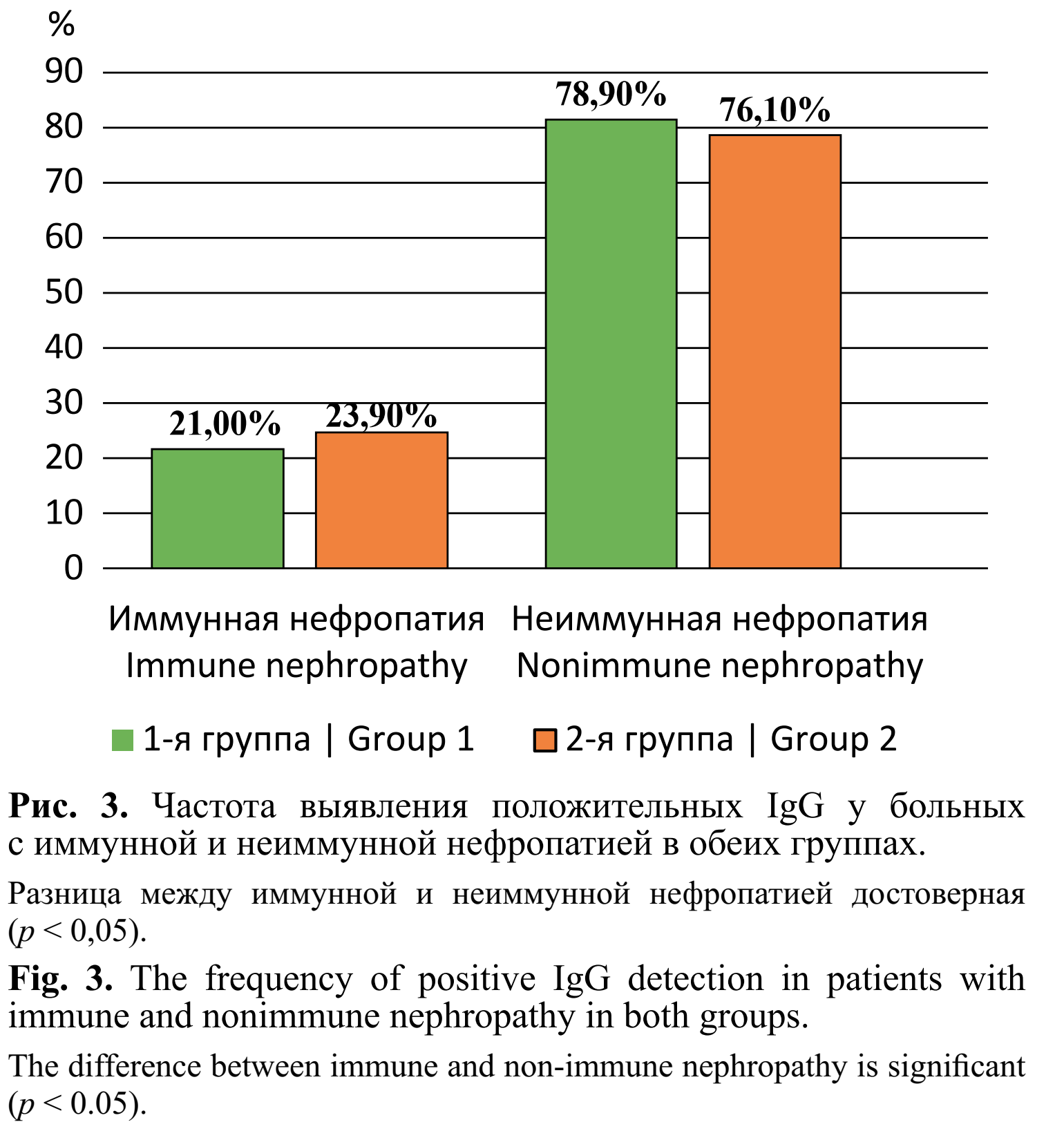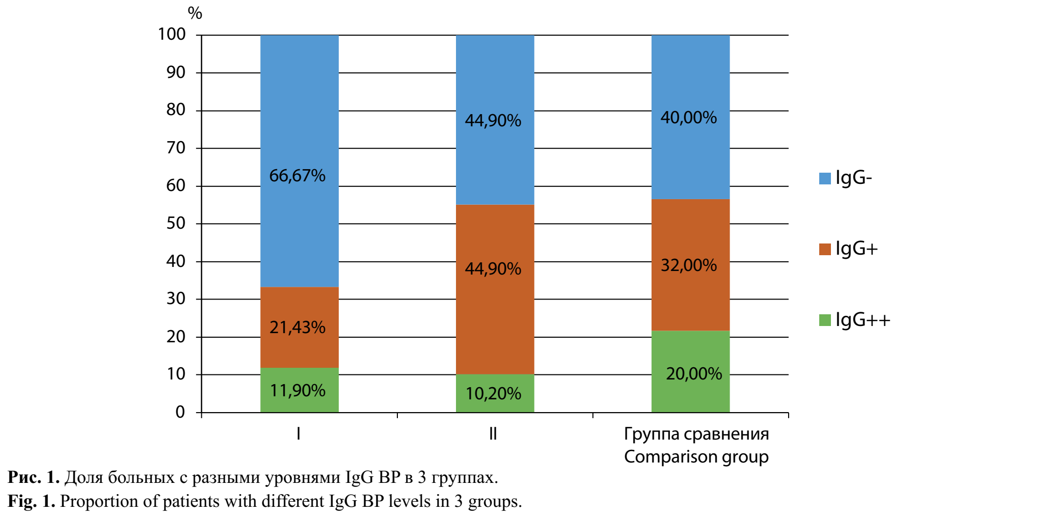 Заключение. Проведённый анализ показал, что 67,7% пациентов с ХБП 3-й стадии и 47% больных с ХБП 5-й стадии имели отрицательные IgG к BP, что существенно увеличивает риск инфицирования в данной когорте пациентов и требует обязательного проведения иммунизации в предтрансплантационный период.