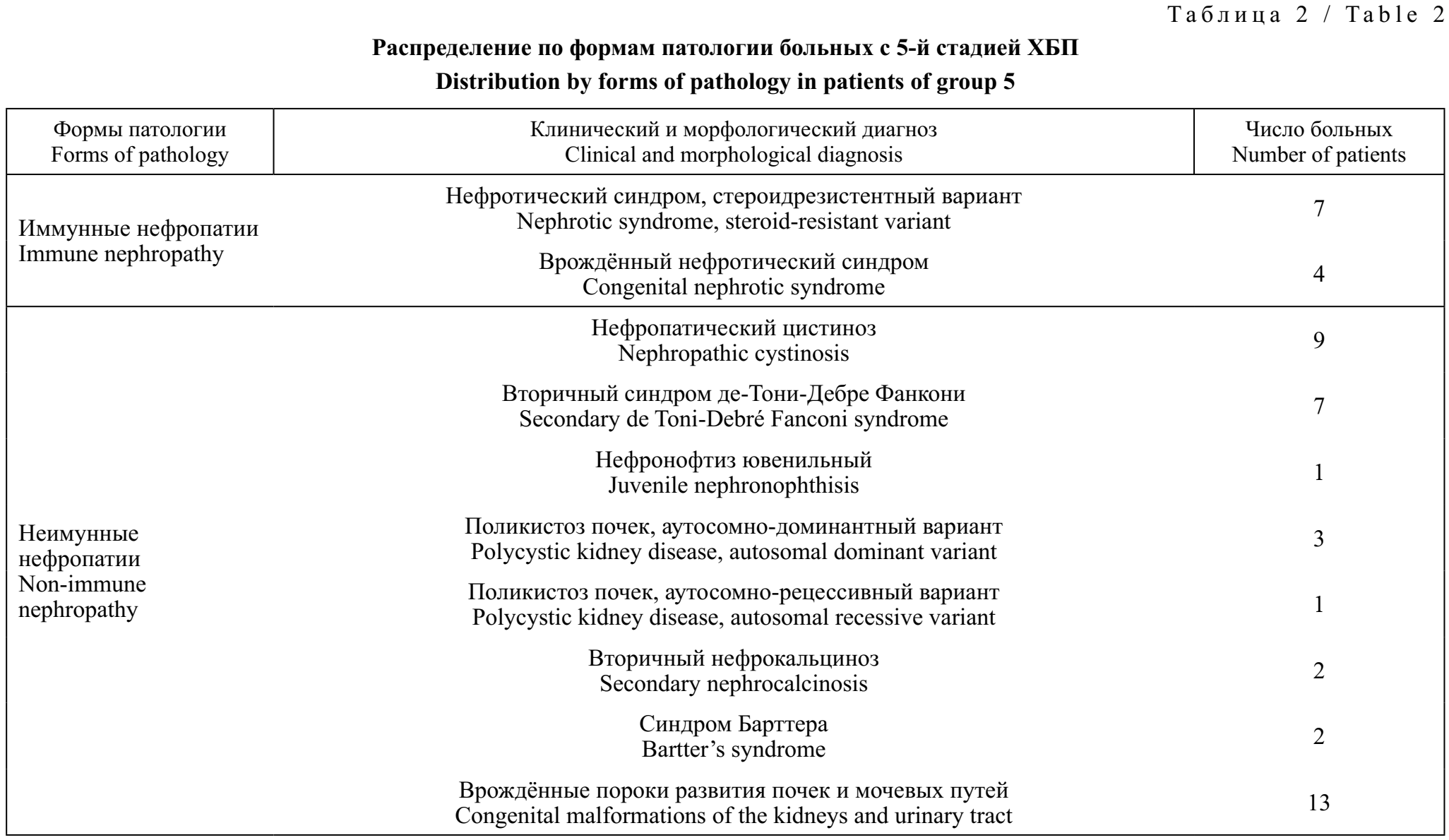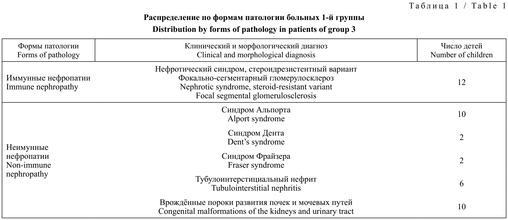 Учитывая патогенетические особенности течения нефропатий, больные 1-й и 2-й групп были распределены на 2 подгруппы: с иммуноопосредованными и с неиммунными болезнями. Была выполнена стратификация по формам патологии (табл. 1, 2).
