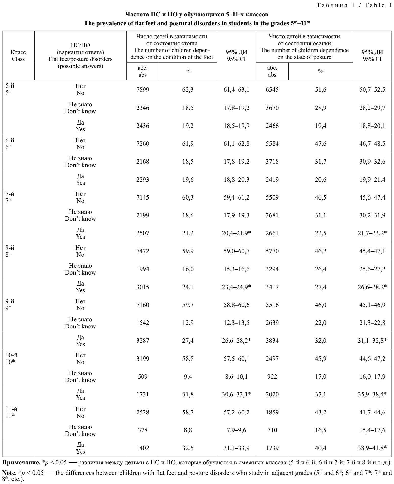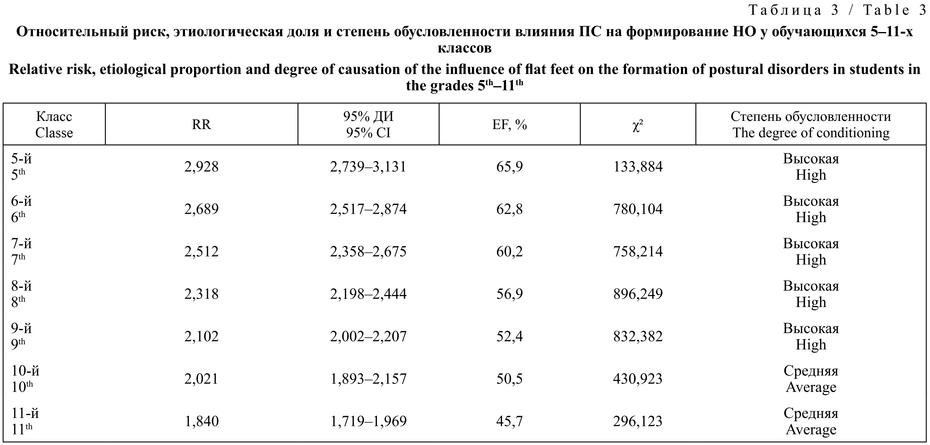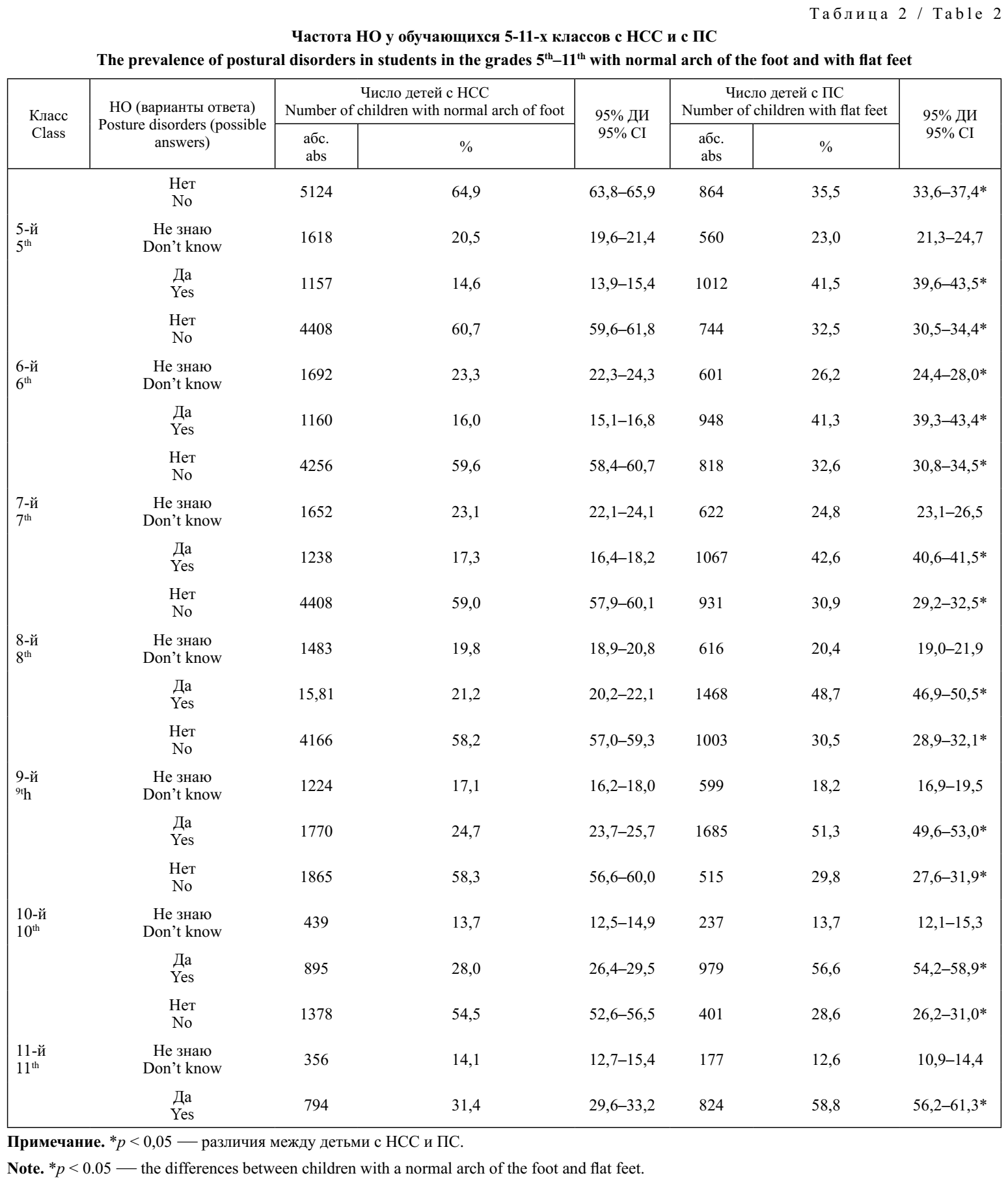 Результаты. У детей с ПС частота нарушений осанки была увеличена в течение всего периода обучения в средней и старшей школе. У обучающихся 5-х классов с нормальным сводом стопы частота НО составляла 14,6% (95% ДИ 13,9–15,4), с ПС — 41,5% (95% ДИ 39,6–43,5); p < 0,05. У обучающихся 11-х классов НО отмечались чаще как при нормальном своде стопы, так и при ПС, — соответственно, у 31,4 (95% ДИ 29,6–33,2) и 58,8% (95% ДИ 56,2–61,3) обучающихся; p < 0,05. Значения RR = 2,928 (95% ДИ 2,739–3,131) и EF = 65,9% у обучающихся 5-х классов свидетельствуют о высокой обусловленности НО влиянием ПС. У обучающихся 11-х классов значения RR = 1,840 (95% ДИ 1,719–1,969) и EF = 45,7% указывают на среднюю степень обусловленности.