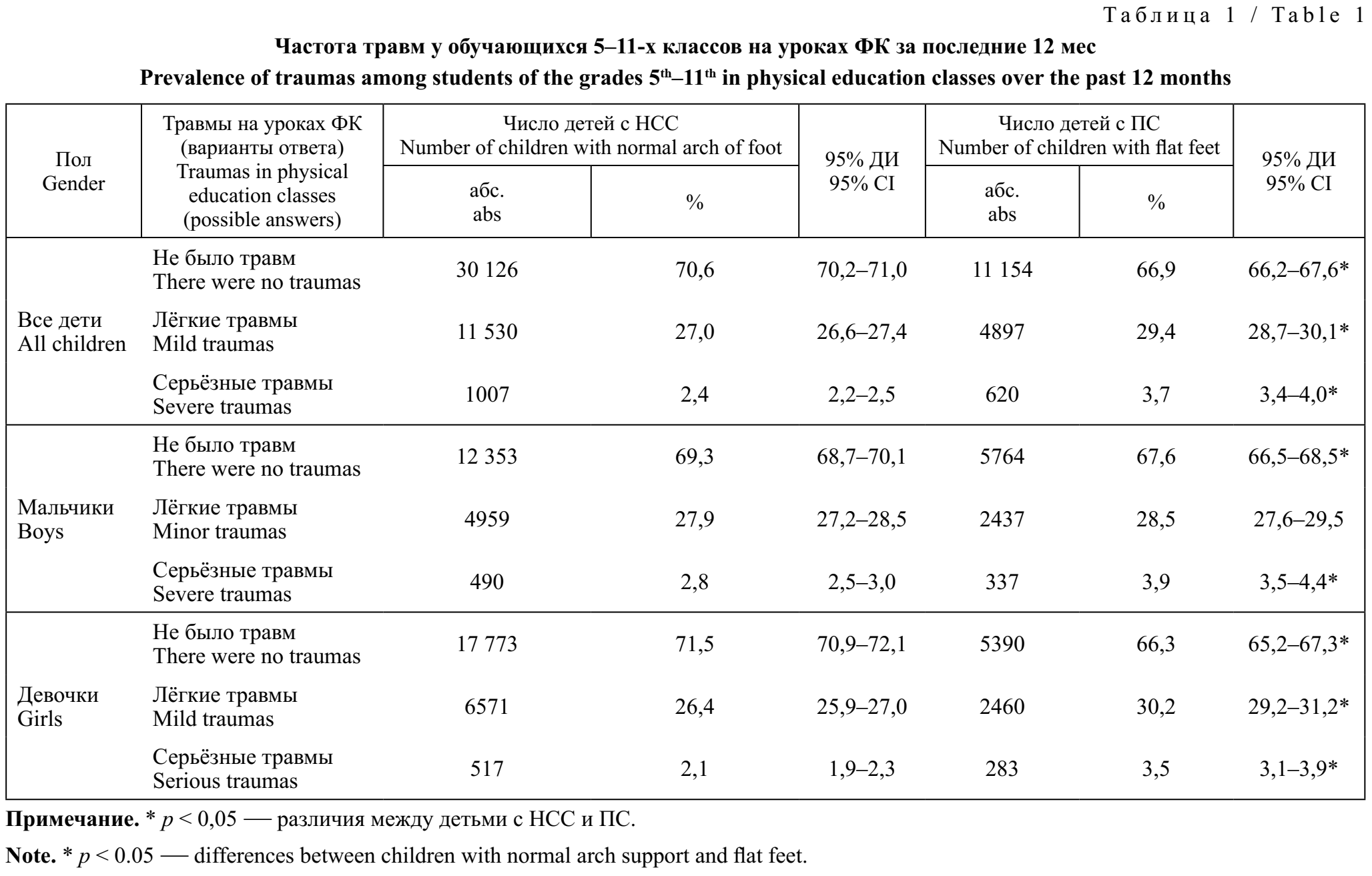Результаты. У детей с плоскостопием по сравнению с детьми с нормальным сводом стопы травмы отмечались чаще — в 33,1 и 29,4% случаев соответственно (p < 0,05). Это справедливо в отношении как лёгких (29,4 и 27,0% соответственно; p < 0,05), так и серьёзных (3,7 и 2,4% соответственно; p < 0,05) травм. При нормальном своде стопы травмы чаще отмечались у мальчиков — 30,6% (95% ДИ 29,9–31,3), чем у девочек — 25,5% (95% ДИ 25,0–26,1; p < 0,05), при плоскостопии таких различий не выявлено — 32,5% (95% ДИ 31,5–33,5) и 33,7% (95% ДИ 32,7–34,8; p > 0,05) соответственно. Риск вероятности влияния плоскостопия на возникновение лёгких травм имеет малую степень обусловленности (EF = 3,6% у мальчиков и EF = 13,9% у девочек), серьёзных травм — среднюю (EF = 35,0% у мальчиков и EF = 43,0% у девочек). Серьёзные травмы чаще определялись у мальчиков, чем у девочек, как с нормальным сводом стопы (2,8 и 2,1% соответственно; p < 0,05), так и с плоскостопием (3,9 и 3,5% соответственно; p < 0,05).